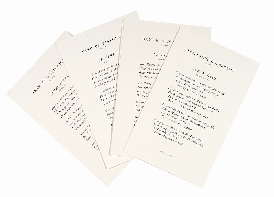In-4° (mm 336x210). Pagine XXVII, [1], 263, [5]. In barbe. Brossura editoriale con titoli in rosso e nero al piatto anteriore e al dorso. Sovraccoperta e custodia in cartonato rigido. Esemplare n° 154/350 impresso su carta fabbricata dalle manifatture Ventura di Cernobbio. SI AGGIUNGE: Mazzini Giuseppe, Pensieri [...] scelti da Terenzio Grandi. Alpignano: A. Tallone, 1961. In-4° (mm 290x180). Pagine 210, [8]. Con 3 riproduzioni di autografi dell'autore legate fuori testo. In barbe. Brossura editoriale con titoli in blu scuro al piatto anteriore e al dorso. Custodia in cartonato rigido. Tiratura limitata a 606 esemplari. SI AGGIUNGE: Medici Lorenzo (detto il Magnifico), ...Poemetti e canti carnascialeschi. Alpignano: A. Tallone, 1966. In-4° (mm 335x210). Pagine XXI, [1], 154, [6]. In barbe. Brossura editoriale con titoli impressi in blu scuro al piatto anteriore e al dorso. Custodia in cartonato rigido. Esemplare n° 35/724 impresso su carta ventura di Cernobbio. SI AGGIUNGE: AA.VV, Poesie Classiche. S.l.: A. Tallone, s.d. [i.e. 1978 ca.]. In-4° (mm 375x238). [15] carte sciolte contenute in cofanetto in cartone con titoli impressi in nero al piatto anteriore. Sovraccoperta e custodia in cartonato rigido. SI AGGIUNGE: Edizioni Tallone. Catalogo. Alpignano: A. Tallone, 1983. In-8° stretto (mm 256x123). Brossura editoriale con titoli in nero al piatto anteriore.