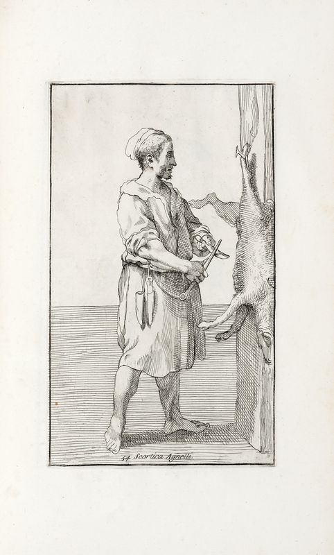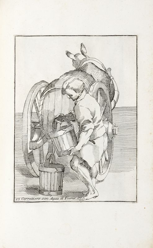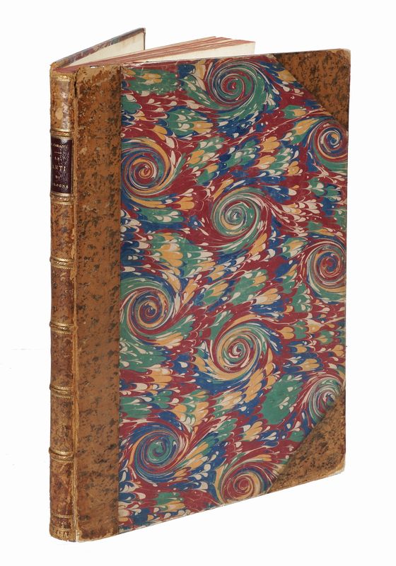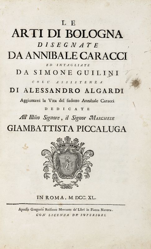 In folio (mm 415x260). Pagine 8, [2] e 81 tavole a piena pagina in calcografia, di cui una non numerata con ritratto di Carracci e 80, numerate 1-80, ciascuna accompagnata da didascalia incisa nella lastra accanto al numero. Strappo restaurato alla tavola 57, lieve gora d'acqua nel margine inferiore di alcuni fascicoli centrali ma ottima copia, marginosa e ben conservata. Legatura in mezza pelle bazzana con angoli, piatti in carta decorata e titoli impressi in oro su tassello al dorso. Tagli rossi. Mancanze alle cuffie e lungo le unghiature.