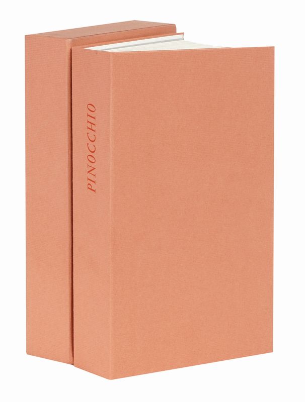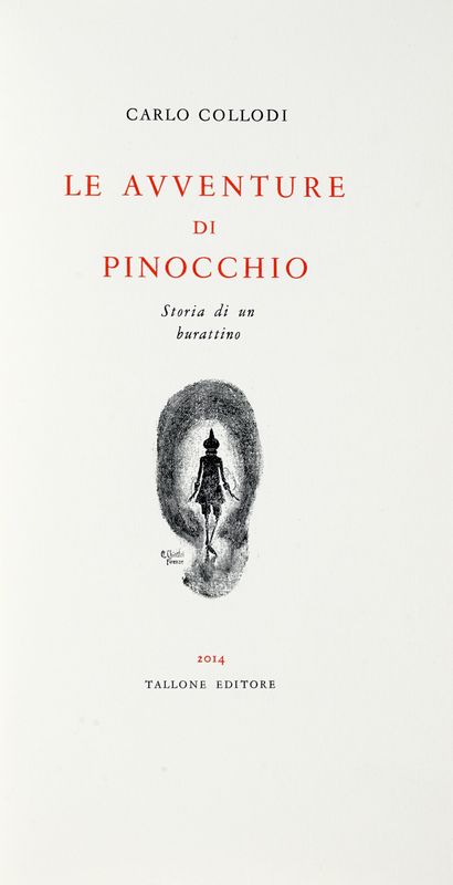 In-8° (mm 274x150). Pagine 314, [6] con un disegno originale a mano libera con penna biro di Chiara Spagnoli Gabardi (Blue Fairy). Condizioni perfette. Es. n. 61 su una tiratura complessiva di 450 esemplare, uno dei 219 su velina avorio della Cartiera San Giovanni di Pescia. Camicia e custodia editoriali, sulla prima impressi titoli e riproduzione di una delle illustrazioni di Chiostri al piatto anteriore. Custodia in cartonato color albicocca.