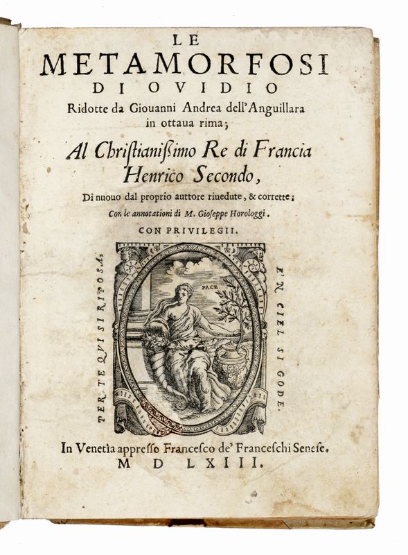 In-4° (mm 200x145). Carte [6], 73, [2], 74-266. Marca xilografica sul frontespizio, fregi xilografici nel testo. Piccolo lavoro di tarlo restaurato nel margine inferiore dei fascicoli da E a K che tocca occasionalmente piccole porzioni di una lettera, alcune carte macchiate e una leggera gora nel margine esterno di alcuni fascicoli. Legatura successiva in mezza pergamena con punte e piatti in carta decorata, titolo in oro su tassello al dorso, tagli spruzzati di rosso. Mancanze ai piatti e alla cuffia inferiore.