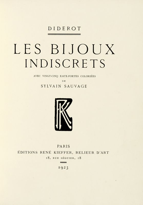 In-4° (mm 275x200). Pagine [8], 255, [3] con 25 acqueforti originali a colori di Sylvain Sauvage. Bella legatura in piena pelle a grana larga, con impressioni a secco ai piatti, titoli in oro al dorso a 2 nervi, sguardie in carta decorata e taglio superiore dorato. Pecetta di René Kieffer reliures d'Art al verso del foglio di guardia anteriore. Rilegato all'interno il dorso della brossura originale. Esemplare n. 196 su una tiratura complessiva di 600 copie, uno dei 500 esemplari con uno stato dell'acquaforte. Ottima copia in barbe.