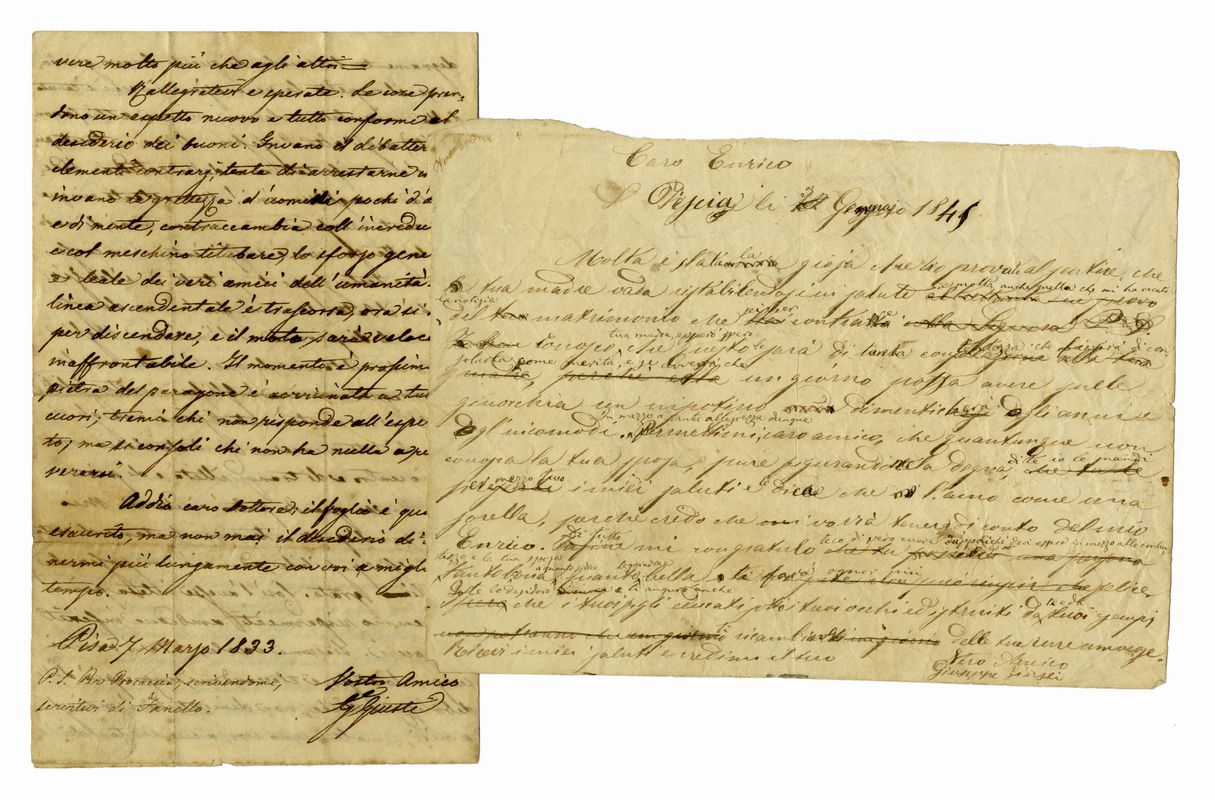 Manoscritto a inchiostro nero. 1 bifolio, scritte4 pagine. Dimensioni: 228x125 mm. SI AGGIUNGE: Id.Minuta di lettera autografa firmata. Datata 3 gennaio 1845.