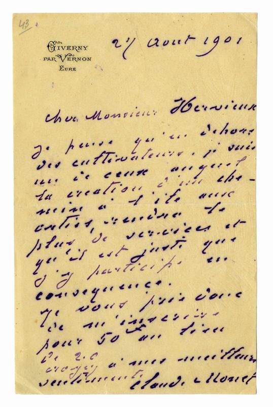 Manoscritto a inchiostro blu. 1 carta, scritta al recto. Su carta intestata “Giverny / par Vernon / Eure”. Dimensioni: 208x133 mm.