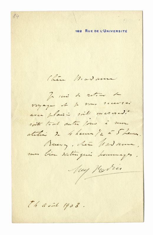 Manoscritto a inchiostro bruno. 1 bifolio, scritta 1 pagina. Su carta intestata “182 Rue de l’Université”. Dimensioni: 202x125 mm.