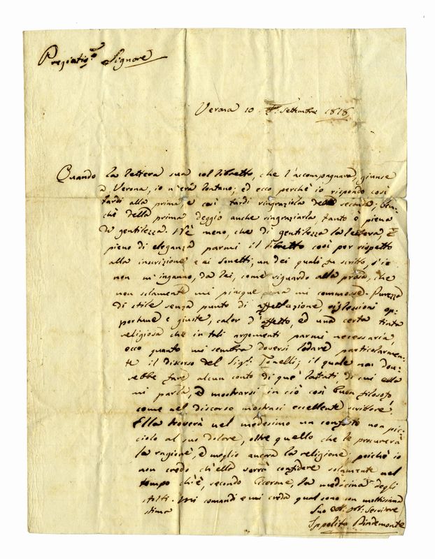 Manoscritto a inchiostro nero. 1 bifolio, scritta 1 pagine. Al verso della seconda carta (con brevi strappi) il nome del destinatario. Dimensioni: 255x190 mm.
