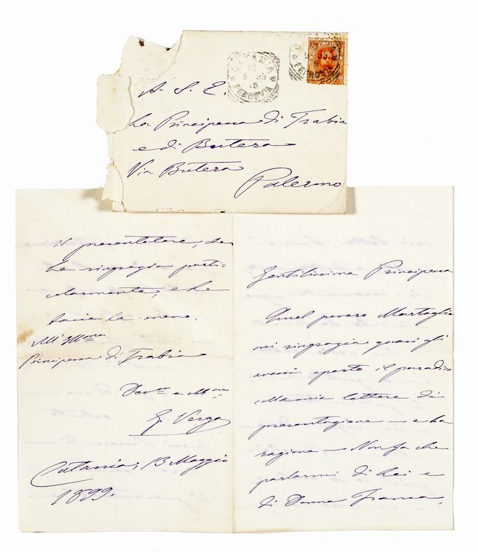 Manoscritto a inchiostro blu, autografo firmato. Un bifolio, scritte otto pagine. Busta viaggiata conservata. Dimensioni: mm 115x175.