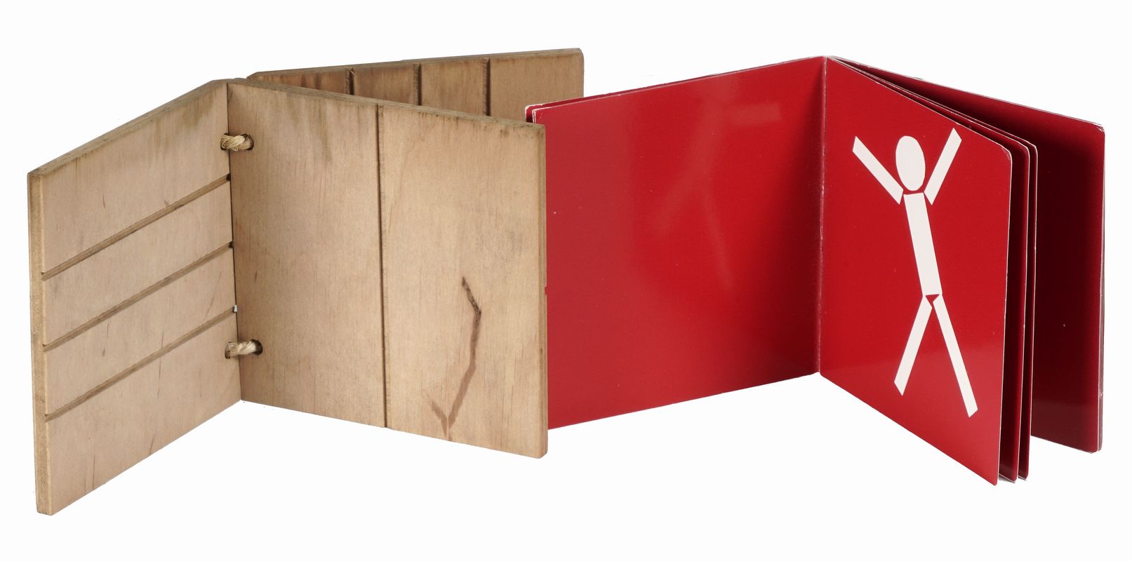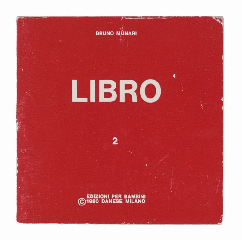 In-16° quadrato (mm 97x97). Carte [10] in cartoncino rosso, con illustrazioni che mostrano la figura stilizzata di un omino, stampato in bianco e ruotato in varie posizioni. Brossura originale in cartoncino rosso, legato con punto metallico, con titoli stampati in bianco, al contrario, ad entrambi i piatti. Minimi segni di usura. SI AGGIUNGE: Id., Libro 9. Milano: Danese, 1980. In-16° quadrato (mm 97x97). Con, complessivamente, 3 pagine-tavoletta in legno naturale di 5 mm di spessore ciascuna, con scanalature orizzontali e verticali, e legate con cordoncino. Titoli in nero ai piatti. Alcune macchie.
