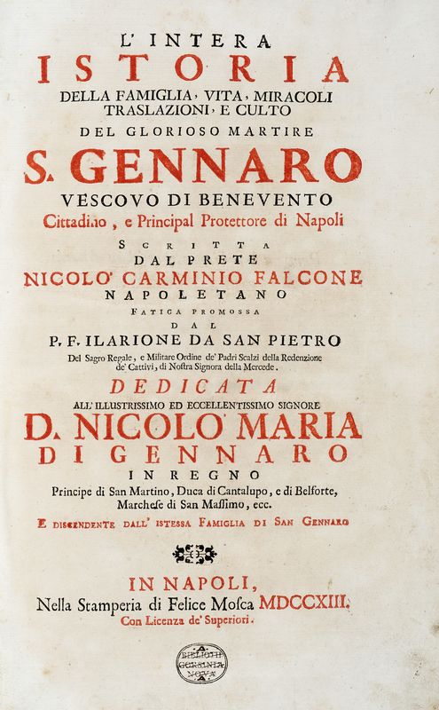 In folio (mm 375x235). Pagine [20], DXXVI con 1 antiporta e 5 tavole [di 13], di cui 4 ripetizione dell'incisione in antiporta e una bella raffigurazione di S. Gennaro a volo d'uccello sopra Napoli che tenta di arrestare l'eruzione del Vesuvio. Alcuni fascicoli bruniti, occasionali fioriture. Legatura in piena pergamena coeva con titoli in oro al dorso (ricostruito successivamente). Tagli blu. Alcune mancanze alle cuffie. Timbro di precedente collezione al frontespizio.