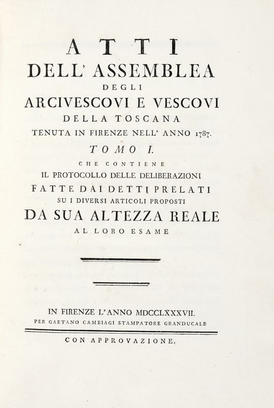Compongono il lotto: 1) Atti dell'assemblea degli arcivescovi e vescovi della Toscana tenuta in Firenze l'anno 1787. Tomo I [-IV]. In Firenze: per Gaetano Cambiagi stampatore granducale, 1787. 4 volumi in-4° (mm 285x205). 2) Apologia contro la censura fatta da XIV vescovi della Toscana ad alcuni libri pubblicati in Pistoia… In Firenze: per Gaetano Cambiagi stampatore granducale, 1787. In-4° (mm 285x205). 3) Tanzini Reginaldo, Istoria dell'assemblea degli arcivescovi e vescovi della Toscana tenuta in Firenze l'anno 1787. Firenze : per Gaetano Cambiagi stampatore granducale, 1788. In-4° (mm 285x205). 4) Punti ecclesiastici compilati e trasmessi da Sua Altezza Reale a tutti gli arcivescovi e vescovi della Toscana e loro respettive risposte. In Firenze : per Gaetano Cambiagi stampatore granducale, 1787. In-4° (mm 285x205). Mancanti le due tavole fuori testo segnalate da OPAC.