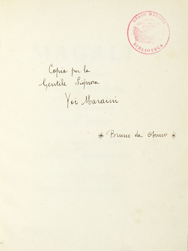 In-8° grande (mm 240x178). Pagine [34] con 12 poesie in provenzale con traduzione italiana a fronte, abbellite da 24 silografie di Bruno da Osimo, più 2 in fine. Frontespizio e occhietto in inchiostro blu e nero. Brossura editoriale in cartoncino crespo illustrata ai piatti lievemente fioriti. Esemplare n. 58 su una tiratura di 100 copie fuori commercio firmate da Bruno da Osimo al colophon. Dedica autografa dell'Artista a Yoi Crosse, moglie di Antonio Maraini. Copia proveniente dalla biblioteca di Grato Maraini. SI AGGIUNGE: Marsili Bruno (detto Bruno Da Osimo), 12 Sonetti a S. Chiara d'Assisi. Milano: Vincenzo Colonnello Editore, 1961. In-8° (mm 245x175). Brossura editoriale illustrata al piatto anteriore.