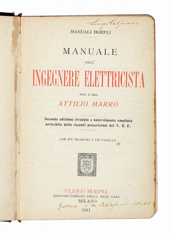 In-16° (mm 145x95). Legatura originale in piena tela con titoli impressi in oro a dorso e piatto anteriore. SI AGGIUNGE: Colombo Giuseppe, Manuale dell'ingegnere civile e industriale. Milano: Ulrico Hoepli, 1939. In-16° (mm 152x100). Legatura originale in piena tela con titoli impressi in argento al dorso e piatto anteriore.