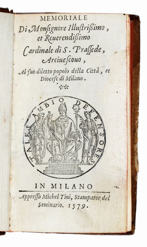 In-12° (mm 125x65). Pagine 502, [1], 1 bianca. Illustrazione a piena pagina in legno a pagina 420. Piccoli forellini di tarlo nel margine interno delle carte, per il resto buona copia, seppur corta di margini. Legatura settecentesca in mezza pelle con punte e piatti in carta. Titolo impresso su tassello al dorso. SI AGGIUNGE: Synodus dioecesana mediolanensis [...] habita anno 1636. Mediolani: Ex Typographia Archiepiscopali, 1636. In-12° (mm 162x105). Pagine [8], 529, 3 bianche. Lievissime bruniture marginali, per il resto buona copia. Legatura coeva in piena pergamena con titolo manoscritto al dorso. Mancanza alla cuffia superiore.