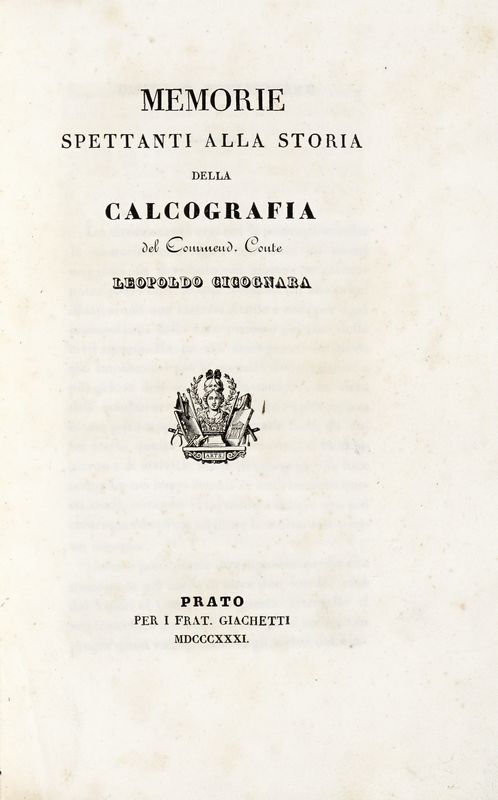 In-8° (mm 230x145). Pagine 262, 2 bianche. Sporadiche fioriture ma buona copia. Legatura coeva in mezza pelle con piatti in carta marmorizzata e titoli in oro al dorso. SI AGGIUNGE: Memorie spettanti alla storia della calcografia [...] tavole XVIII in folio con un volume in-8°. Prato: Tipografia dei ff. Giachetti, 1831. In folio (mm 430x310). Contiene 18 tavole a piena pagina numerate I-XIII (alcune doppie). Minimi difetti, ottima copia. Legatura coeva in mezza pelle con piatti in percallina e titolo impresso in oro al dorso. Piccole mancanze lungo cerniere e unghiature. Conservata all'interno la brossura del volume.