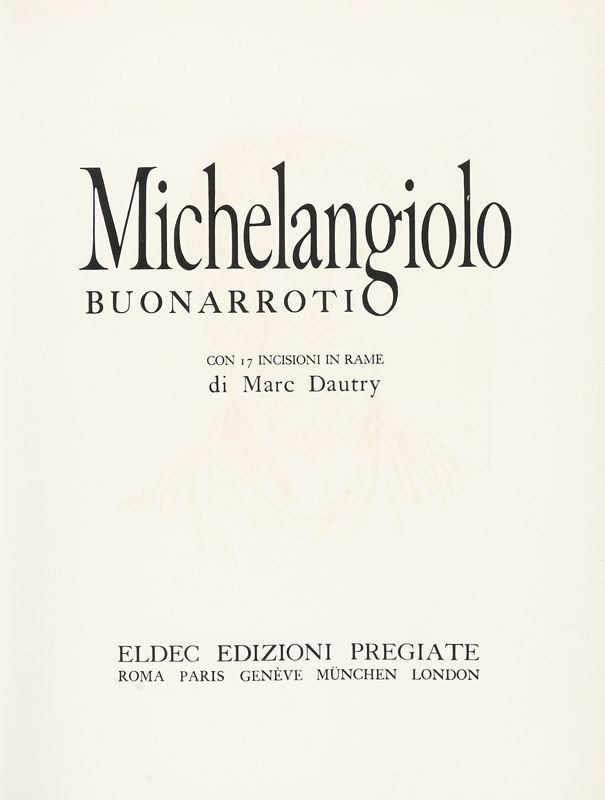 2 volumi in-folio (mm 430x320). Contiene incisioni fuori testo firmate a matita da Marc Dautry. Alcune carte con bruniture, per il resto ottimo stato conservativo. Legatura originale a busta in piena pelle con bande e titolo impresso in oro a piatto anteriore e dorso. Sguardie con riproduzione di manoscritto. Perfetta conservazione.