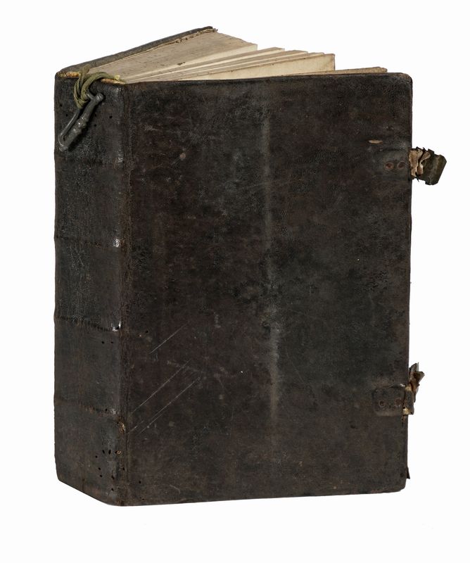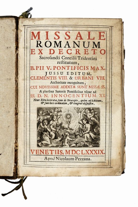 In-8° (mm 220x145). Pagine [48], 640, CXXI, [1], [2] bianche. Frontespizio stampato in rosso e nero con graziosa incisione a bulino raffigurante un ostensorio adorato dagli Angeli. Numerose incisioni in legno a piena pagina nel testo. Ampia gora marginale, concentrata principalmente nella prima e ultima parte del volume, macchie e fioriture sparse. Parzialmente allentate le pagine CXV-CXXI e con un forellino di tarlo al margine superiore che non tocca l'inciso. Legatura coeva in piena pelle muta, con dorso a 4 nervetti e fermagli al piatto. Forellini di tarlo, difetti ai fermagli e un taglio al contropiatto anteriore. Nota di appartenenza al verso del foglio di guardia anteriore.