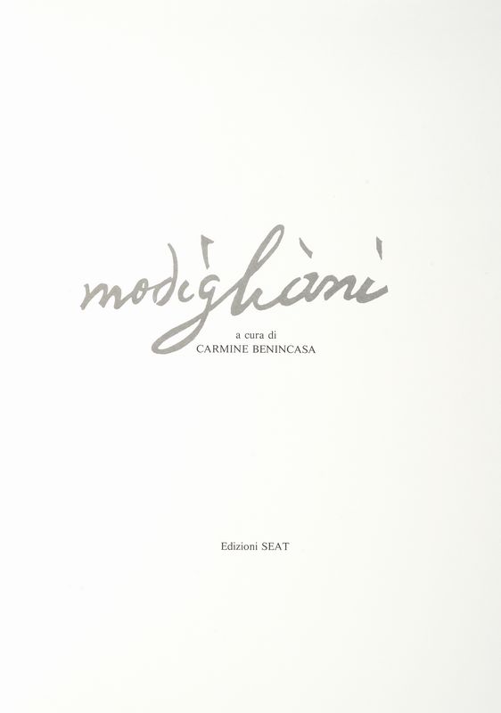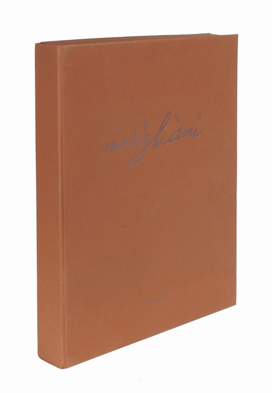 In-folio (mm 515x366). Pagine 32, [8]. Con 46 tavole sciolte fuori testo, protette da carta feltro, che riproducono fedelmente le opere di Amedeo Modigliani. Ingiallimento ad alcune delle carte protettiva, altrimenti perfetto stato di conservazione. Testo a bifoli sciolti entro cartella editoriale in pieno cartonato; il tutto entro cofanetto editoriale in piena tela color mattone, con titoli al piatto anteriore. Esemplare n. 1152/3000.