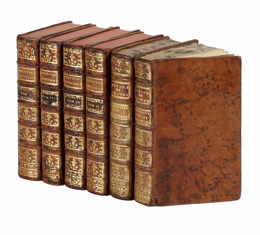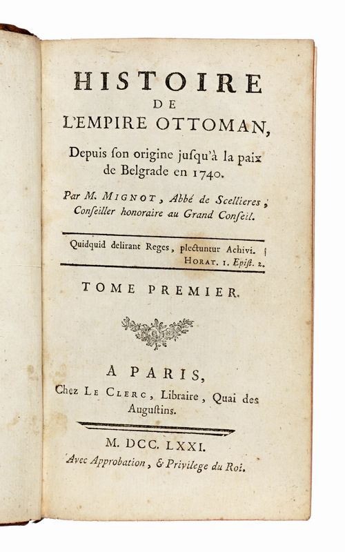 2 volumi in-12° (mm 163x90). Pagine XXI, [3], 392 con 7 tavole ripiegate fuori testo; IV, 404 [i.e. 386] con 8 tavole ripiegate fuori testo. Gora nel margine interno del primo volume, alcune macchie, assenti nel secondo volume 8 carte al fascicolo K, altre occasionali fioriture ma copia completa delle 15 tavole ripiegate. Legatura coeva in piena pelle con titoli e decorazioni in oro impressi ai comparti del dorso. Tagli spruzzati, sguardie in carta marmorizzata. SI AGGIUNGE: Mignot Vincent, Histoire de l'Empire Ottoman... Tome premier (-quatrieme). A Paris: chez Le Clerc, libraire, quai des Augustins, 1771. 4 volumi in-12° (mm 165x96). Assente la carta ripiegata fuori testo. Legatura coeva in piena pelle con titoli e decorazioni in oro impressi ai comparti del dorso. Tagli rossi, sguardie in carta marmorizzata.