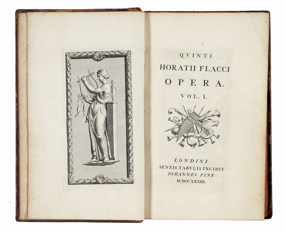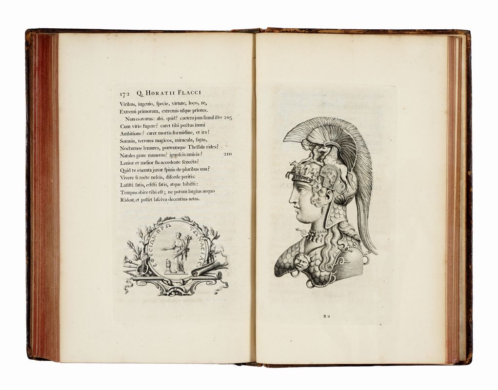 2 volumi in-8° (mm 225x131). Pagine [28], 264; [22], 191, [15]. Con, complessivamente, 2 antiporte e 7 tavole calcografiche fuori testo, alcune incise recto e verso. Interamente realizzato in calcografia. Bell'apparato decorativo, con numerosissime testatine, capilettera e finalini incisi, oltre a numerose illustrazioni interne alle pagine. Lievi macchioline sparse,altrimenti ottima copia. Legatura in pieno maculata nocciola con cornici impresse in oro ai piatti; titoli in oro al dorso a 5 nervi, comparti decorati. Unghiature dorate. Un taglio centrale al dorso del primo volume e altri, minimi, difetti alle cuffie. Tracce di colla di nastro adesivo ai fogli di guardia. Ex-libris al contropiatto anteriore di entrambi i volumi.