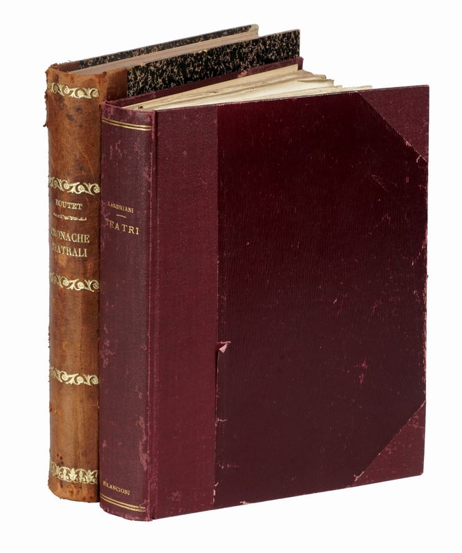 4 parti in 1 volume in-4° (mm 242x175). Pagine [2], 53, 1 bianca con 1 frontespizio calcografico e 3 tavole ripiegate fuori testo numerate I-III; 43, 1 bianca con un frontespizio calcografico nel testo e 7 tavole fuori testo numerate IV-X; 60 con 1 frontespizio calcografico e 5 tavole fuori testo numerate I-V; 40 con 1 frontespizio calcografico e 2 tavole fuori testo numerate I-II. Con nel complesso 4 bei frontespizi incisi e 17 tavole ripiegate fuori testo. Esemplare con fioriture, più visibili nella seconda parte del volume, e occasionali strappetti marginali. Legatura successiva in mezza percallina rossa con punte e piatti in carta decorata. Titolo in oro al dorso. Legatura leggermente lisa. Nota di possesso manoscritta al primo occhietto. SI AGGIUNGE: Boutet Edoardo, Le cronache teatrali. Roma: Società Editrice Nazionale, 1900.