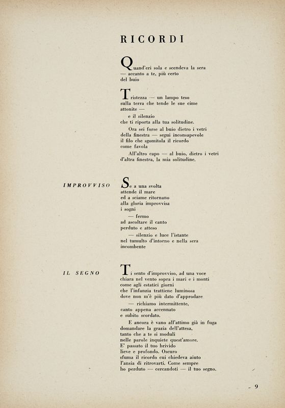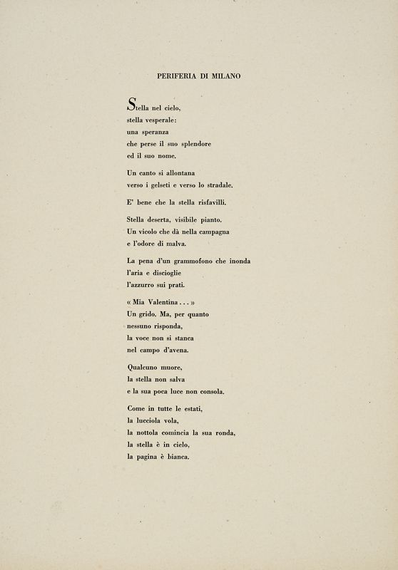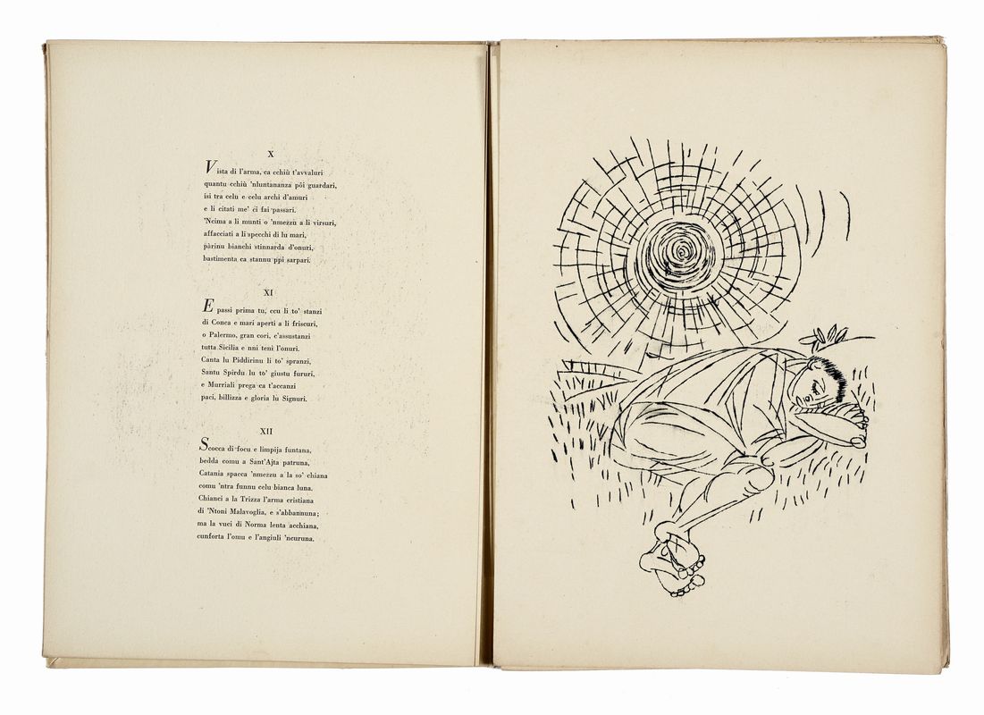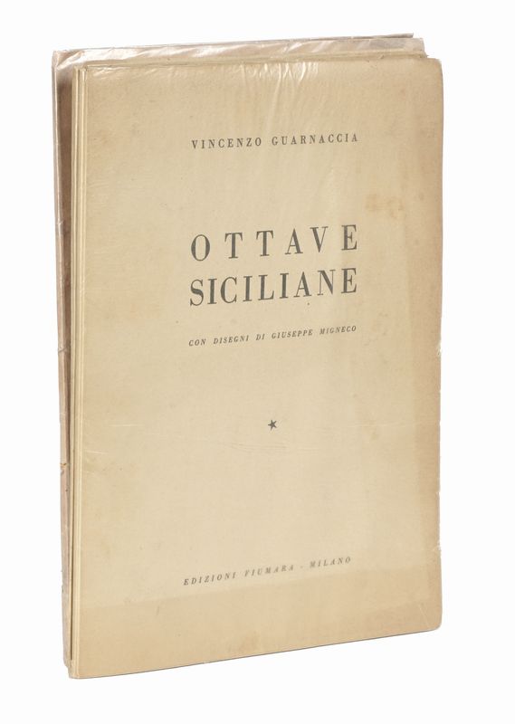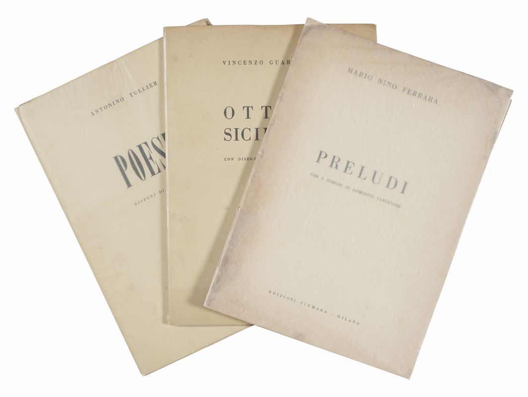 In-4° (mm 330x234). Pagine [18] + 6 riproduzioni in bianco e nero e a piena pagina fuori testo. Copia a fogli sciolti. Carte lievemente brunite con tracce di foxing. Brossura editoriale con titoli in nero al piatto anteriore. Difetti ai piatti. Esemplare n. 13/200. SI AGGIUNGE: Ferrara Mario Nino, Preludi. Con 6 disegni di Domenico Cantatore. Milano: Edizioni Fiumara, 1951. In-4° (mm 338x241). Pagine [4], 12, [2] + 6 riproduzioni in bianco e nero e a piena pagina fuori testo. Copia a fogli sciolti. Brossura editoriale con titoli in nero al piatto anteriore. Gore d'acqua ai piatti. Esemplare n. 26/110. SI AGGIUNGE: Tullier Antonino, Poesie. Disegni di Aligi Sassu. Pagine [12] + 6 riproduzioni in bianco e nero e a piena pagina fuori testo. Copia a fogli sciolti. Carte lievemente brunite con tracce di foxing. Brossura editoriale con titoli in nero al piatto anteriore. Macchie ai piatti. Esemplare n. 24/110.