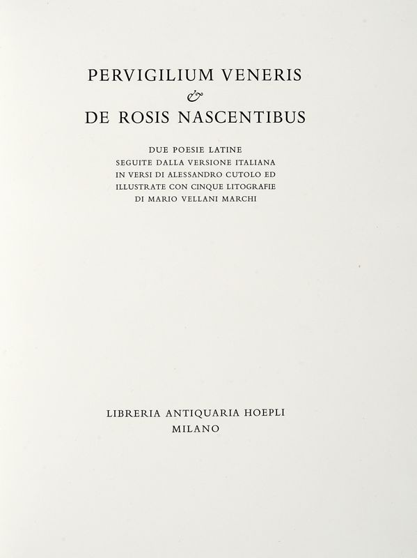 In-4° (mm 310x230). Pagine 36, [6], 2 carte bianche iniziali e in fine. Con 5 litografie disegnate e acquarellate di Mario Vellani-Marchi, di cui 2 a piena pagina. Splendido esemplare in barbe, ad ampi margini. Cartonato editoriale in carta Roma avorio con marca dell'editore impressa in oro al piatto anteriore. Custodia in cartone. Esemplare n. 48 su una tiratura a 165 copie numerate su carta a tino Magnani
