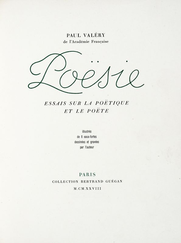 In-4° piccolo (mm 260x196). Pagine XVI, 197, [9]. Con 8 acqueforti originali di Paul Valéry fuori testo, protette da velina. Marginoso, bell'esemplare, perfettamente conservato nelle sue barbe. Brossura editoriale con sovraccoperta in pieno cartonato rustico, con titolo applicato al piatto anteriore e al dorso. Parzialmente staccato, ma ben conservato il piatto anteriore. Plastica protettiva rimovibile, con titoli e indicazione della tiratura applicati al piatto con nastro adesivo. Esemplare 102 su una tiratura complessiva di 330, uno dei 300 su véli royal pur chiffon des manufactures de Canson-Montgolfier numerati da 1 a 300, firmati dall'Autore.
