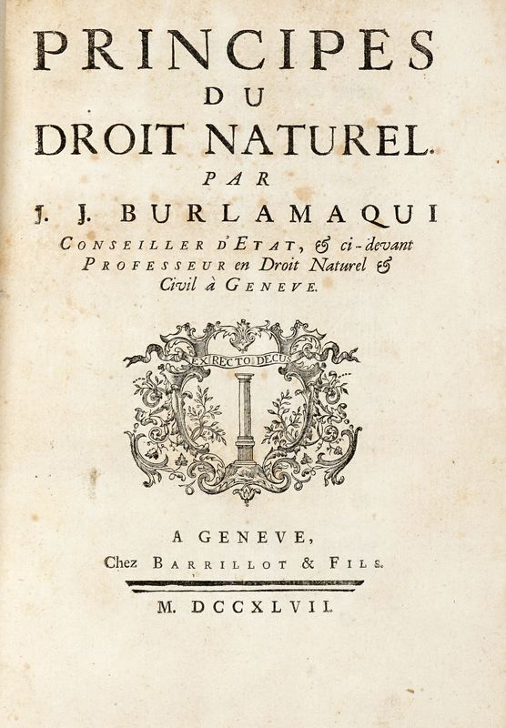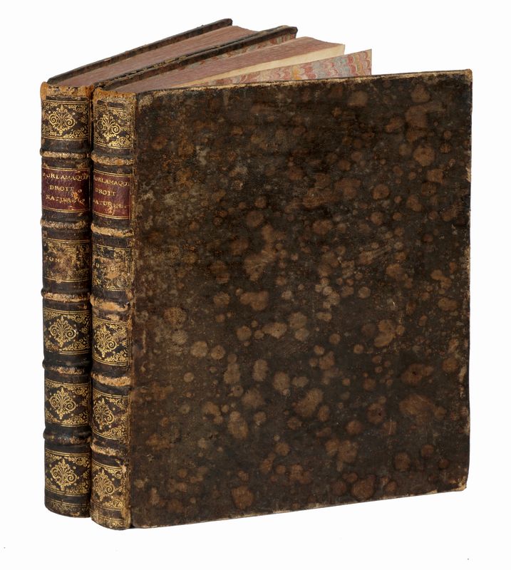 In-4° (mm 240x175). Pagine XXIV, 352. Bruniture alle carte, più concentrate in alcuni fascicoli, sporadiche macchie. Legatura coeva in piena pelle con titoli e decorazioni dorate ai comparti del dorso. Tagli rossi, sguardie in carta decorata. SI AGGIUNGE: Principes du droit politique. S.l.: s.e., 1754. In-4° (mm 240x175). Pagine VI, 305, [1]. Copia parzialmente brunita. Legatura coeva in piena pelle con titoli e decorazioni dorate ai comparti del dorso. Tagli rossi, sguardie in carta decorata.