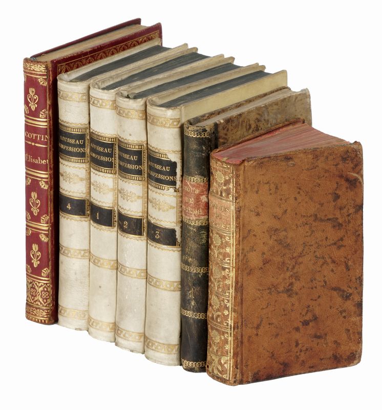 Compongono il lotto: 1) Malherbe François de, Poesies [...] rangees par ordre chronologique. A Geneve: s.l., 1777. In-12° (mm 114x60). 2) Duval Nicolas, Nouvelles heures gravees au burin dediees au Roy... A Paris: chez J. Mariette, 1687 [i.e. 1740 ca.]. In-12° (mm 120x80). 3) Voltaire François-Marie Arouet (de), Chefs-d'œuvre dramatiques [...]. Tome premier (-quatrième). A Paris: chez Saintin, 1822. 4 volumi in-12° (mm 110x68). 4) Rousseau Jean Jacques, Les confessions [...]. Tome premier (-IV). A Paris: de l'imprimerie et de la fonderie stereotypes de Pierre Didot l'Aine, et de Firmin Didot, 1813. 4 volumi in-12° (mm 130x78). Elenco completo disponibile su richiesta. Lotto non passibile di restituzione.