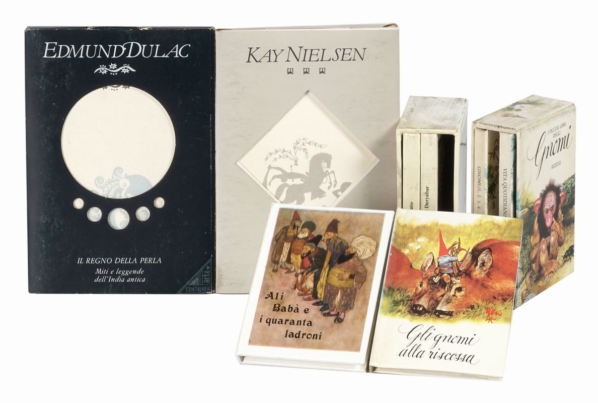 3 volumetti in-32° (mm 83x60). Ciascuno con tavole a piena pagina a colori. Ottimo stato di conservazione. Legatura editoriale in pieno cartonato, illustrata al piatto anteriore dai disegni di Edmond Dulac; entro cofanetto editoriale, anch'esso illustrato ai piatti. SI AGGIUNGE: I piccoli libri degli gnomi. Illustrazioni di Rien Poortvliet. Milano: Rizzoli editore, 1981. 3 volumetti in-32° (mm 88x64) entro cofanetto editoriale illustrato. SI AGGIUNGE: Austin Omar, Dall'età d'oro all'avanguardia: la fiaba nell'immagine di Kay Rasmus Nielsen. S.d.e. [i.e.: Roma: 1986 ca.]. SI AGGIUNGE: Edmond Dulac illustra Il regno della perla. Miti e leggende dell'India antica. S.d.e. [i.e. 1986].
