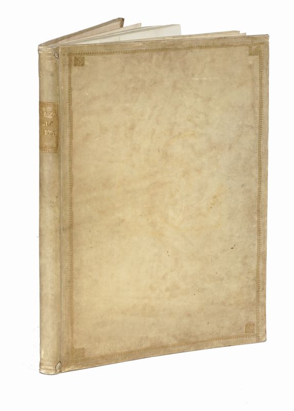 In folio piccolo (mm 310x198). Pagine [14], 128 con 1 antiporta calcografica con 11 [di 16] tavole ripiegate fuori testo. Esemplare privo delle tavole n. 9, 10, 13, 14 e 15, con restauri al verso dell'antiporta, piccolo lavoro di tarlo nel margine inferiore delle prime carte senza perdita di testo o inciso e uno strappo marginale alla carta 11 ma per il resto in ottimo stato conservativo. Legatura successiva in piena pergamena rigida con cornici dorate ai piatti e titolo in oro su falso tassello al dorso.