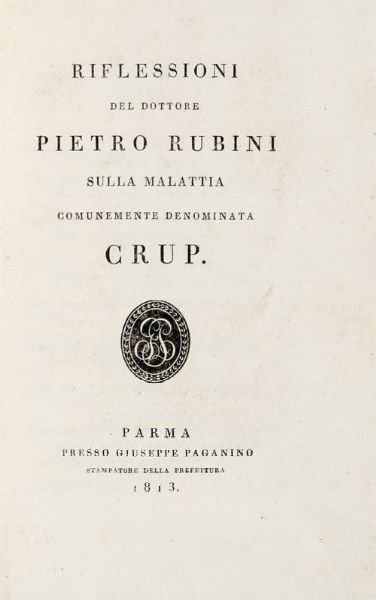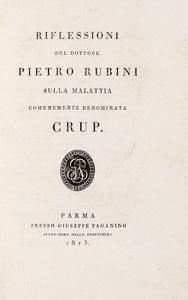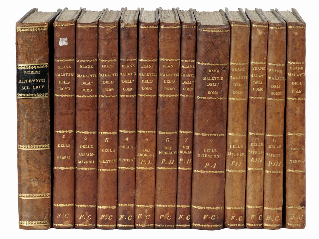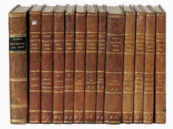 In-8° (mm 221x143). Ottimo esemplare in barbe. Legatura coeva in mezza pelle, con piatti in carta marmorizzata e titoli in oro su tassello al dorso. Un foro di tarlo sulla cerniera anteriore, altrimenti buono stato conservativo. SI AGGIUNGE: Frank Johann Peter, Del metodo di curare le malattie dell'uomo [...] tradotto in italiano e corredato di molte annotazioni [...]. Libro primo. Delle febbri (-settimo. Delle nevrosi). Milano: coi tipi di Giovanni Pirotta, 1831-33. 12 tomi in 12 volumi in-8° (mm 225x131). Legatura coeva omogenea in mezza pelle, con piatti marmorizzati e titoli in oro al dorso. Difetti.