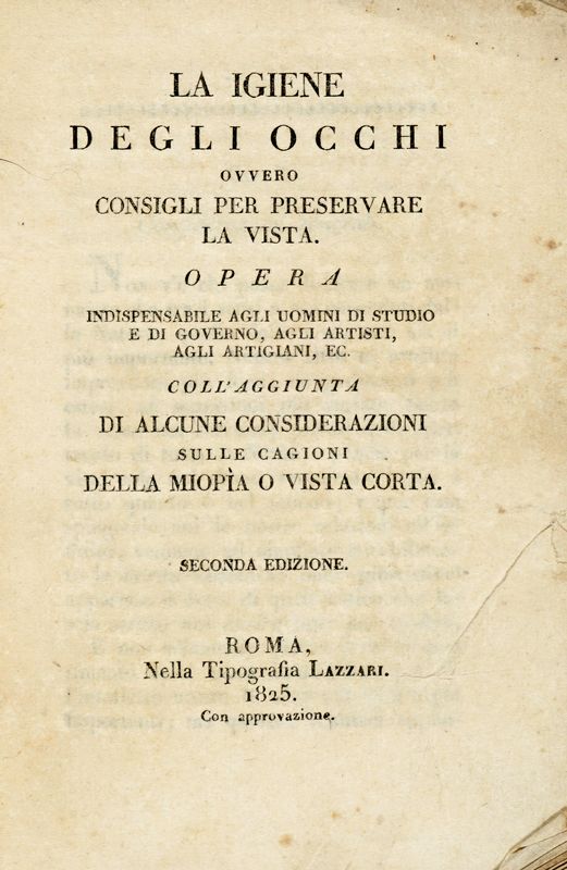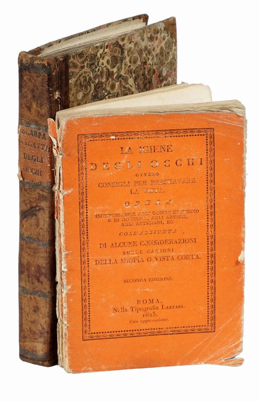 In-8° (mm 188x113). Pagine 352 con 1 ritratto inciso dell'autore in antiporta e 3 tavole calcografiche ripiegate in fine. Alcune arrossature alle prime carte, sporadico e lieve foxing nel testo, per il resto buona copia. Legatura coeva in mezza pelle con piatti in carta marmorizzata e titoli in oro su tassello al dorso. SI AGGIUNGE: La igiene degli occhi ovvero consigli per preservare la vista. Seconda edizione. Roma: nella tipografia Lazzari, 1825. 1 volume in-8° (mm 164x106).