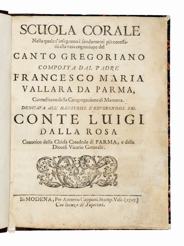 In-4° (mm 240x176). Pagine VIII, 198, [1], 1 bianca. Notazione musicale quadrata su tetragramma nel testo. Leggere gore marginali, alcune fioriture. Legatura ottocentesca in mezza tela con piatti in carta decorata. Al piatto posteriore applicata pecetta con numero di inventario.