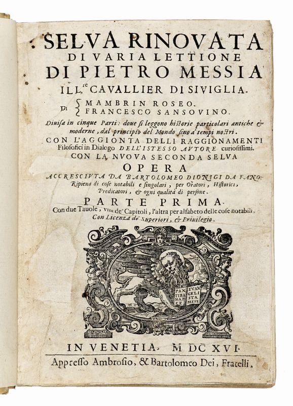 5 parti in 1 volume in-8° (mm 205x140). Pagine [32], 357, [1], 2 bianche; [24], 277, [1], 2 bianche; [16], 214, 2 bianche; [12], 186; [8], 112. Numerose xilografie nel testo. Alcune mancanze reintegrate al frontespizio della prima parte. Probabilmente assente una carta al fascicolo D e restauro che interessa il testo alla carta F4 alla prima parte, mancanza di carta con perdita di testo a carta I7 della seconda parte, strappo a carta G5 della terza parte, ricostruito il margine inferiore delle carte M1 e M2 della quarta parte. Occasionali gore marginali e altri difetti. Legatura moderna in piena pergamena con titolo manoscritto al dorso.