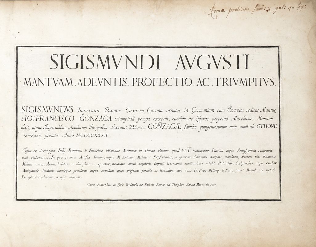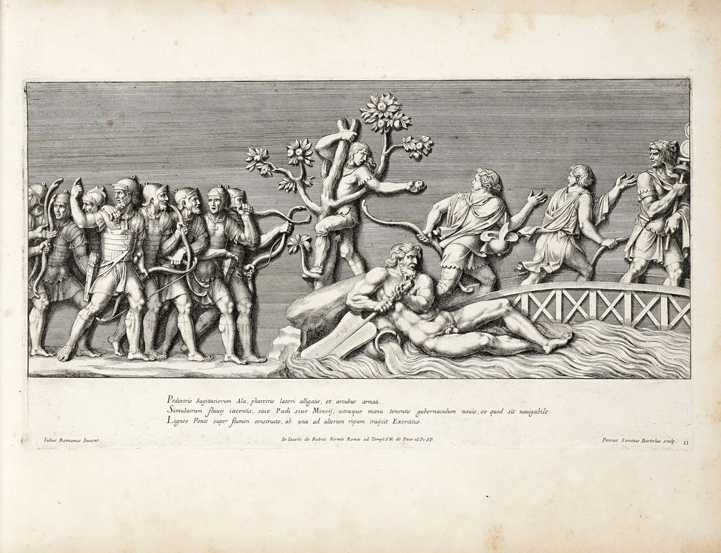 In folio oblungo (mm 356x460). Opera composta da un frontespizio, una carta di dedica a Angelo Conticelli e il ritratto in medaglione dell’imperatore Leopoldo inciso da Jacques Blondeau e da 24 tavole di grandezza omogenea (da tav. 3 a tav. 26, mm 225x405 cadauna). Alcune fioriture e macchie, gora nel margine superiore delle ultime carte, altri minori difetti. Legatura coeva in piena pergamena rigida con titolo in oro su tassello al dorso. Contropiatti in carta decorata. Mancanze in corrispondenza del tassello, alcuni difetti ai piatti. Ex libris di precedente proprietario al contropiatto anteriore, timbro a inchiostro azzurro della stessa proprietà in fine di volume.