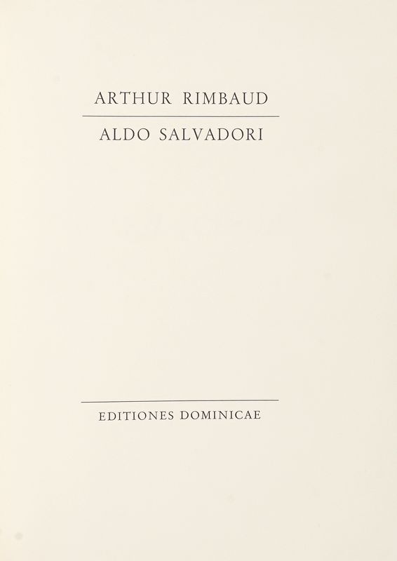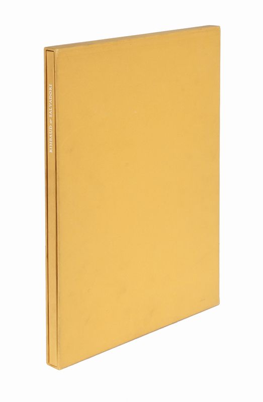 In-folio (mm 370x270). Pagine 23, [7] + 2 acqueforti di Aldo Salvadori. Splendido esemplare in barbe, perfettamente conservato. Brochure editoriale con illustrazione applicata al piatto anteriore; cartella in cartone editoriale giallo, in custodia. Esemplare n. 75 su una tiratura complessiva di 150.