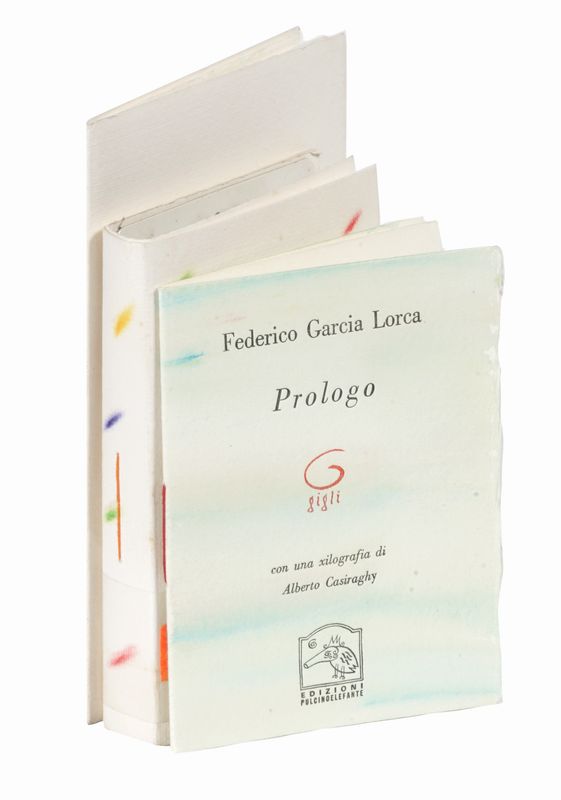 In-16°(mm 167x110). Bifolio. Con all'interno 2 piccoli sonagli in metallo conservati dentro una confezione di plastica applicata direttamente alla carta. Stampato in 21 esemplari. Brossura editoriale illustrata a colori ai piatti e al dorso. Fascetta in plastica trasparente con la scritta inedito in arancione. SI AGGIUNGE: Merini Alda, Il gatto. Acquaforte di Agostino Zaliani. Osnago: Edizioni Pulcinoelefante, 2002. In-16°(mm 197x134). Bifolio. Con 1 acquaforte a piena pagina applicata alla carta. In barbe. Stampato in 30 esemplari. Brossura editoriale illustrata al piatto anteriore. Sovraccoperta in cartone. SI AGGIUNGE: Garcia Lorca Federico, Prologo. Con una xilografia di Alberto Casiraghy. Osnago: Edizioni Pulcinoelefante, 1994. In-16°(mm 153x114). Bifolio. Con 1 xilografia a colori a piena pagina. In barbe. Stampato in 99 esemplari. Brossura editoriale illustrata a colori ai piatti.