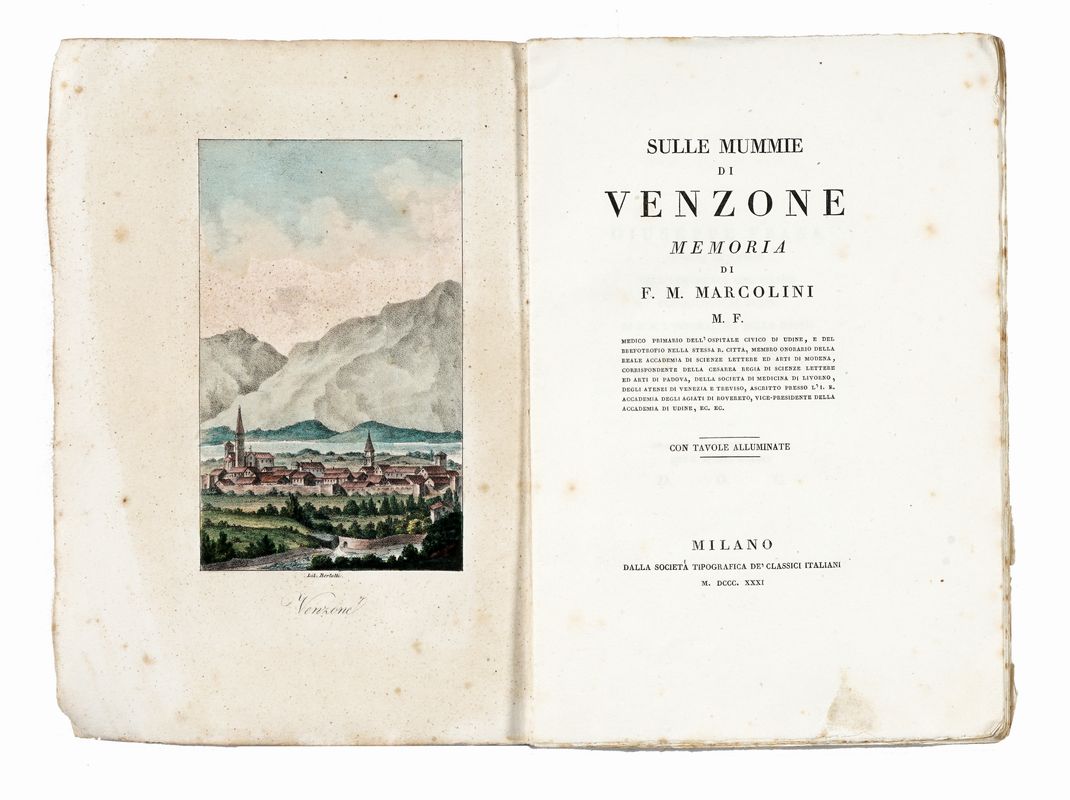 In-8° (mm 232x152). Pagine 159, [1] con 1 veduta di Venzone in antiporta e 14 tavole litografiche numerate in fine, la più parte a colori, incise da Bertotti e disegnate e acquarellate da Filippo Giuseppini. Bell'esemplare in barbe, con alcune fioriture sparse. Brossura editoriale originale in pieno cartonato con titoli impressi ai piatti e al dorso. Vecchia etichetta di collocazione. Alcune fioriture ai piatti, buona conservazione generale. Dedica manoscritta sul piatto anteriore. SI AGGIUNGE: Rossi Gabardi Brocchi Isabella, Girolamo Segato a Firenze. Padova: dal priv. Stabilimento di Giuseppe Antonelli, 1855. In-8° (mm 205x136). Pagine 15, 1 bianca. Fioriture alle carte. Legatura successiva in pieno cartonato marmorizzato.