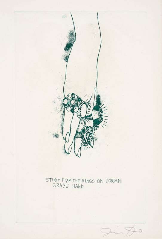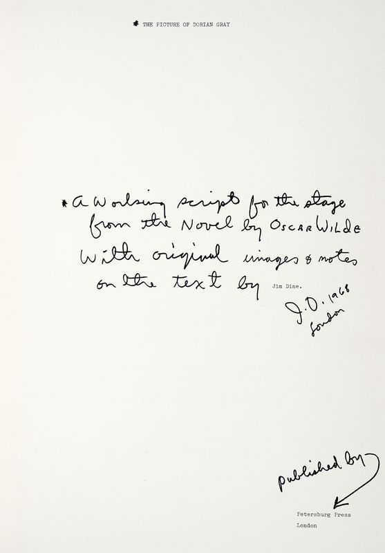 In-folio (mm 440x310). Con 12 litografie a colori di Jim Dine nel testo, di cui una con collage e una con rivestimento in acetato. Splendito esemplare in ottimo stato di conservazione. Con, sciolte, una suite di 4 incisioni firmate a matita in basso a destra dall'Artista, numerate e stampigliate 'Edizione B' al verso. Legatura editoriale in velluto verde, con il titolo stampigliato a lettere d'argento al piatto anteriore; le 4 incisioni sono contenute, sciolte, entro cartella originale in velluto nero. Il tutto entro confanetto in seta nera. Esemplare dell'edizione B, limitata a 200 copie numerate e 25 prove d'artista, tutte su Arches; il nostro è il 193, numerato, annotato e firmato a inchiostro verde da Jim Dine.