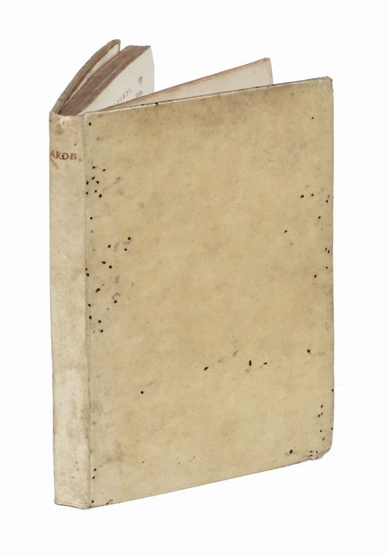 In-8° (mm 175x115). Pagine [16], 112 con 2 tavole calcografiche ripiegate rilegate in fine. Macchia sulla carta di occhietto, lievi fioriture marginali, per il resto buona copia. Legatura coeva in piena pergamena con titolo manoscritto al dorso. Fori e piccoli lavori di tarlo a entrambi i piatti.