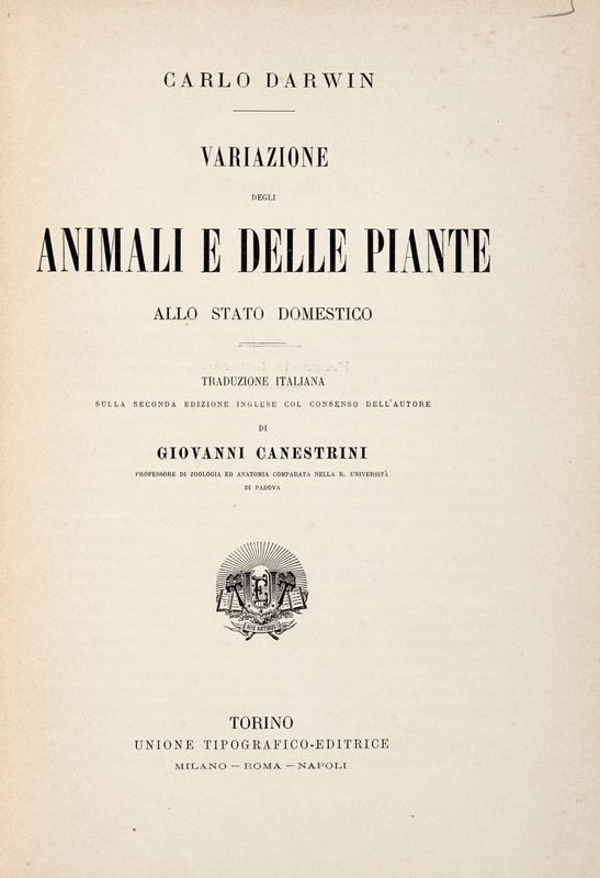 In-8° (mm 260x180). Pagine 824. Con numerose illustrazioni in bianco e nero nel testo. Minimi difetti, altrimenti ottimo stato conservativo. Legatura editoriale in mezza tela rossa, con cornici di filetti concentrici a secco ai piatti e bella incisione in oro a quello anteriore; titoli e fregi in oro al dorso e sguardie in carta decorata. Lievi segni di usura alle cerniere e alle cuffie, e un leggero allentamento interno nella parte anteriore. SI AGGIUGONO: Id., Viaggio di un naturalista intorno al mondo [...]. Prima traduzione italiana con il consenso dell'Autore del professore Michele Lessona... Torino: Unione tipografico-editrice torinese, s.d. [i.e. 1874 ca.]; Id., Il potere di movimento delle piante... Torino: Unione tipografico-editrice, 1884; Id., Le diverse forme dei fiori in piante della stessa specie... Torino: Unione Tipografica Editrice, s.d. [1880 ca.]; Id., I diversi apparecchi col mezzo dei quali le orchidee vengono fecondate dagli insetti... Torino: Unione tipografico-editrice torinese, 1883; Id., La formazione della terra vegetale per l'azione dei lombrici con osservazioni intorno ai loro costumi... Torino: Unione tipografico-editrice, s.d. [i.e. 1880 ca.]; Id., Sulla struttura e distribuzione dei banchi di corallo...Torino: Unione tipografico-editrice, s.d. [i.e. 1880 ca.]; Id., L'origine dell'uomo e la scelta in rapporto col sesso [...]. Prima traduzione italiana... Torino: Unione tipografico-editrice torinese,1888; Id., Gli effetti della fecondazione incrociata e propria nel regno vegetale... Torino: Unione tipografico-editrice, s.d. [i.e. 1878]; Id., Le piante insettivore... Torino: Unione tipografico-editrice, s.d. [i.e. 1878]; Id., L'espressione dei sentimenti nell'uomo e negli animali... Torino: Unione tipografico-editrice torinese, 1890; Id., I movimenti e le abitudini delle piante rampicanti... Torino: Unione tipografico-editrice, 1878. INOLTRE: Colosi Giuseppe, Fauna Italiana. Con 35 tavole [...] e 518 figure. Torino: Unione tipografico-editrice torinese, 1933. In- (mm 250x185). Legatura originale in piena tela, con titoli in oro e impressione a secco al piatto anteriore e al dorso.