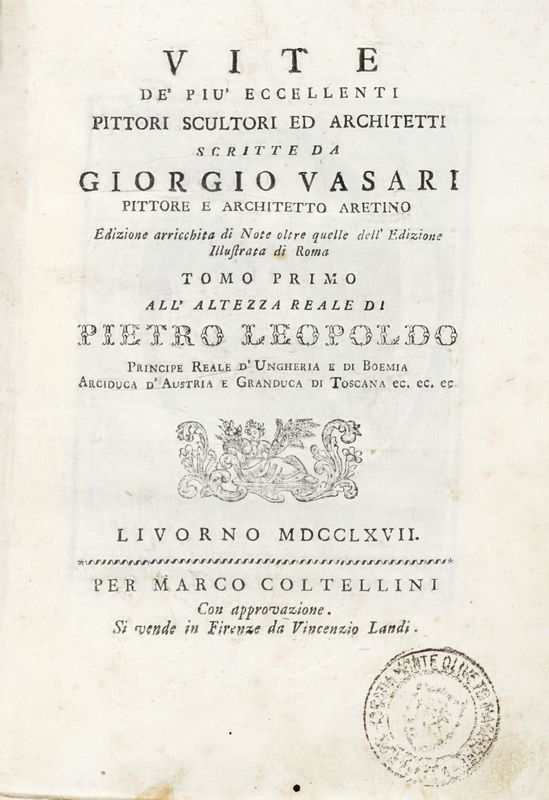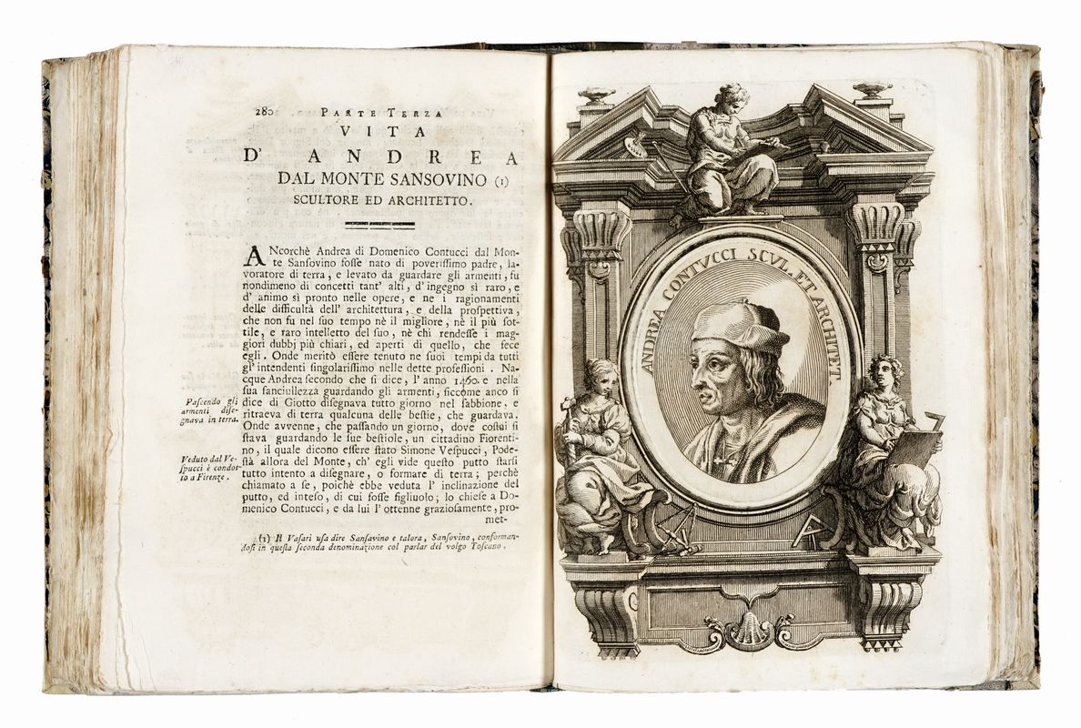 7 volumi in-4° (mm 218x158). Pagine [2], VII, [1], 551, [1]; [2], 611, [1]; [4], 447, [1]; vii, [1], 514, [2]; [4], 468; [4], 450, [2]; [4], 484. Con 158 ritratti e 3 tavole con le opere di Michelangelo al volume VI, il tutto inciso in rame fuori testo. Frontespizio in rosso e nero con marca editoriale con motto 'Nil Candidus' ai volumi II-VII. Esemplare in barbe. Al volume II macchie d'inchiostro al frontespizio e pecetta di rinforzo al margine interno del verso. Al volume V mancanti le carte b1, b3, b4, c1 e l'intero fascicolo d. Al volume VII piccolo strappo al margine superiore della carta Tt3. Bruniture e fioriture a svariati fascicoli, gore d'acqua ad alcune carte. Legatura in mezza pelle con punte in pergamena e piatti in carta marmorizzata. Titoli e fregi in oro impressi al dorso. Piatti anteriori allentati ai volumi II e V. Dorsi sbiaditi. Timbro di precedente collezione ripetuto ai frontespizi.