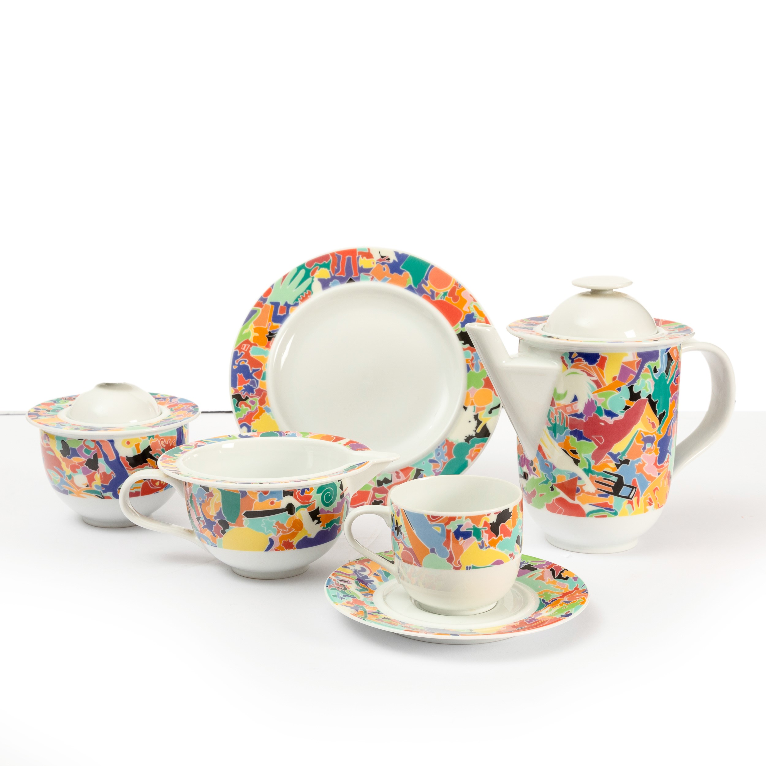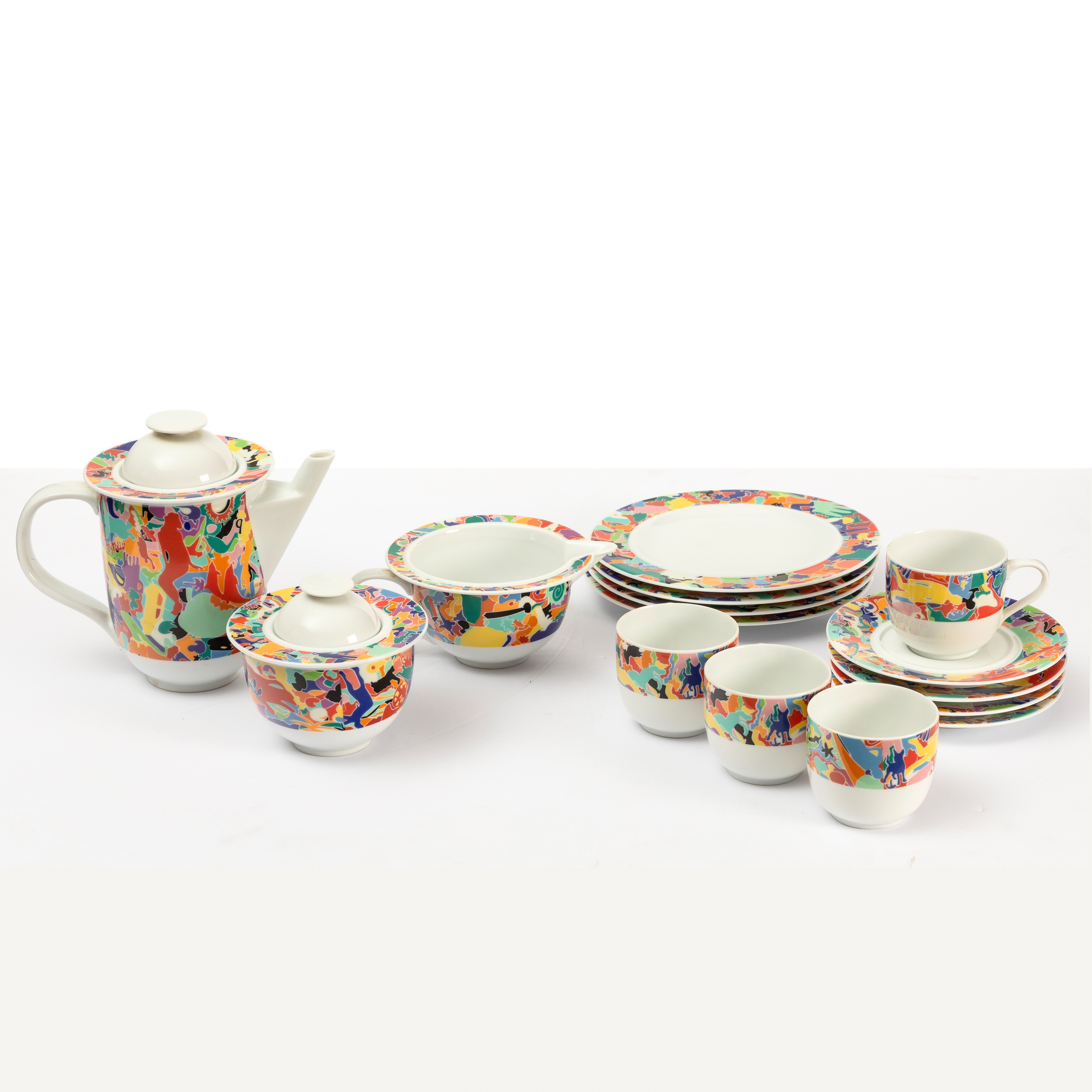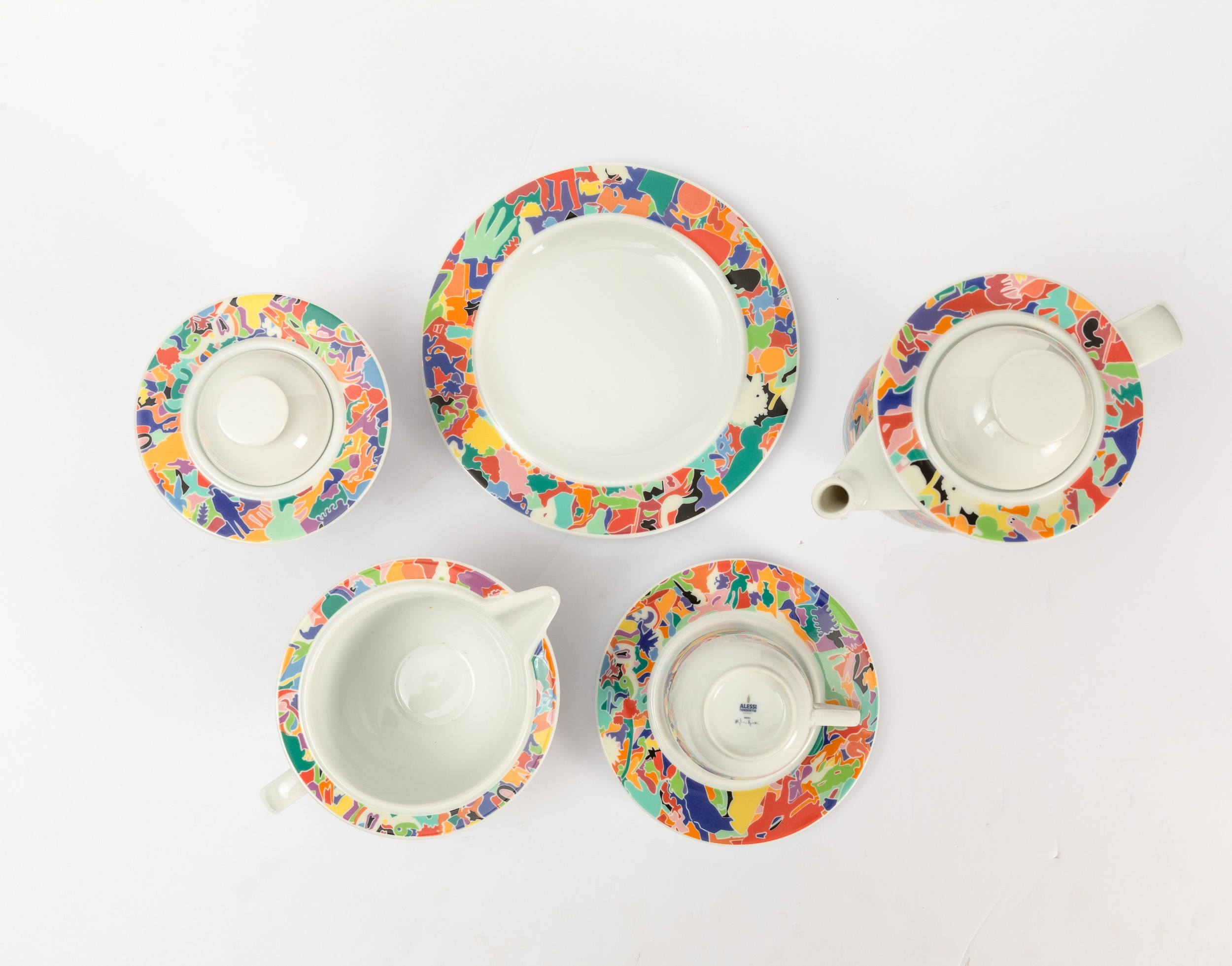 servizio da caffè La Bella Tavola - Alighiero Boetti 1993 set composto da caffettiera, lattiera, zuccheriera e quattro tazze con piattini e quattro piatti da dessert. Design di Ettore Sottsass, decoro di Alighiero Boetti, produzione Alessi, serie Tendenze Caffettiera cm 18x22x12; piattini diam. cm 12,5