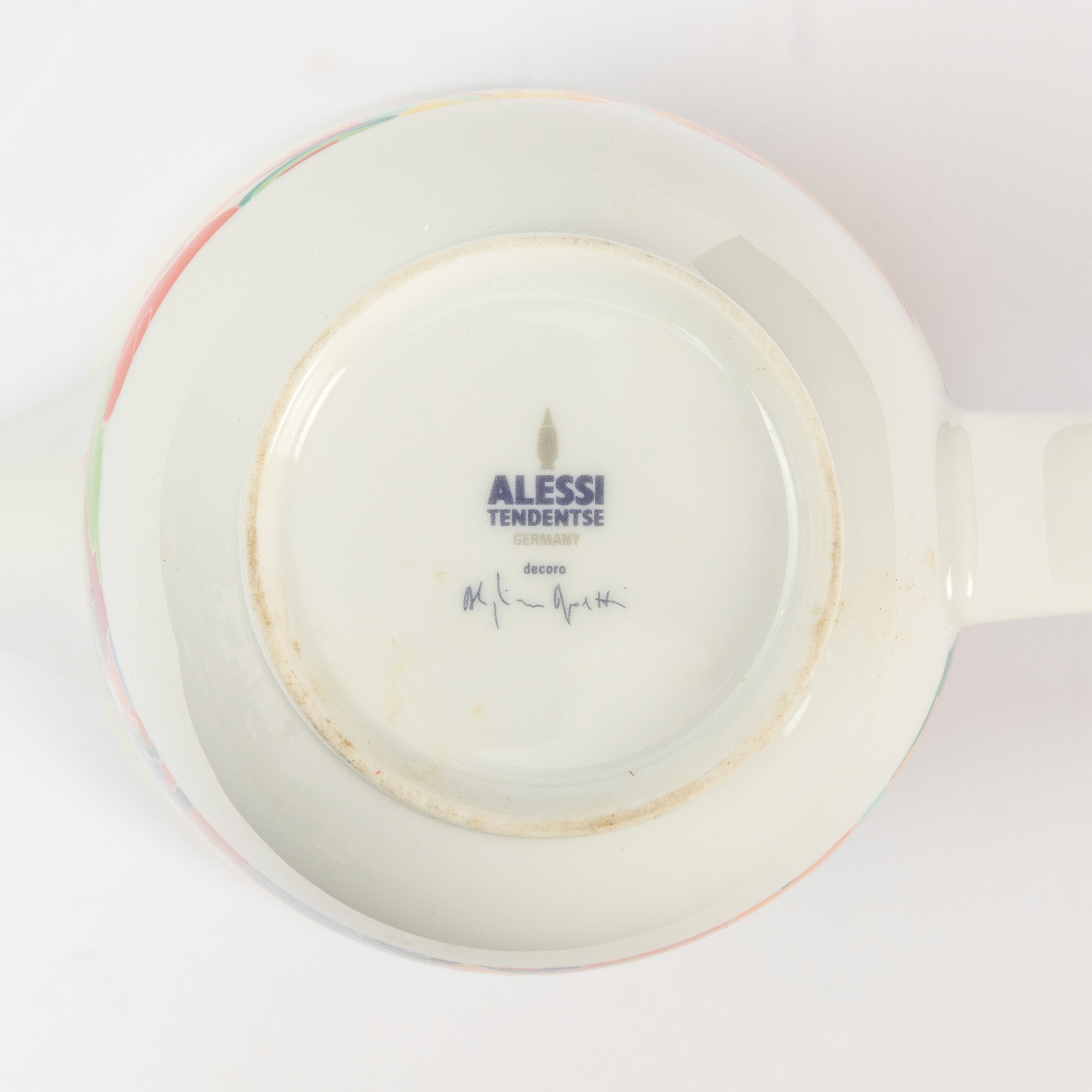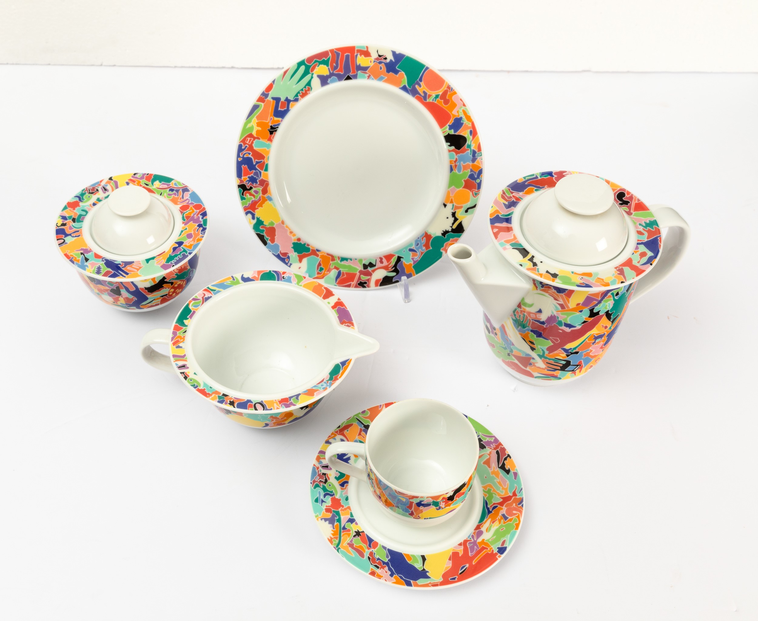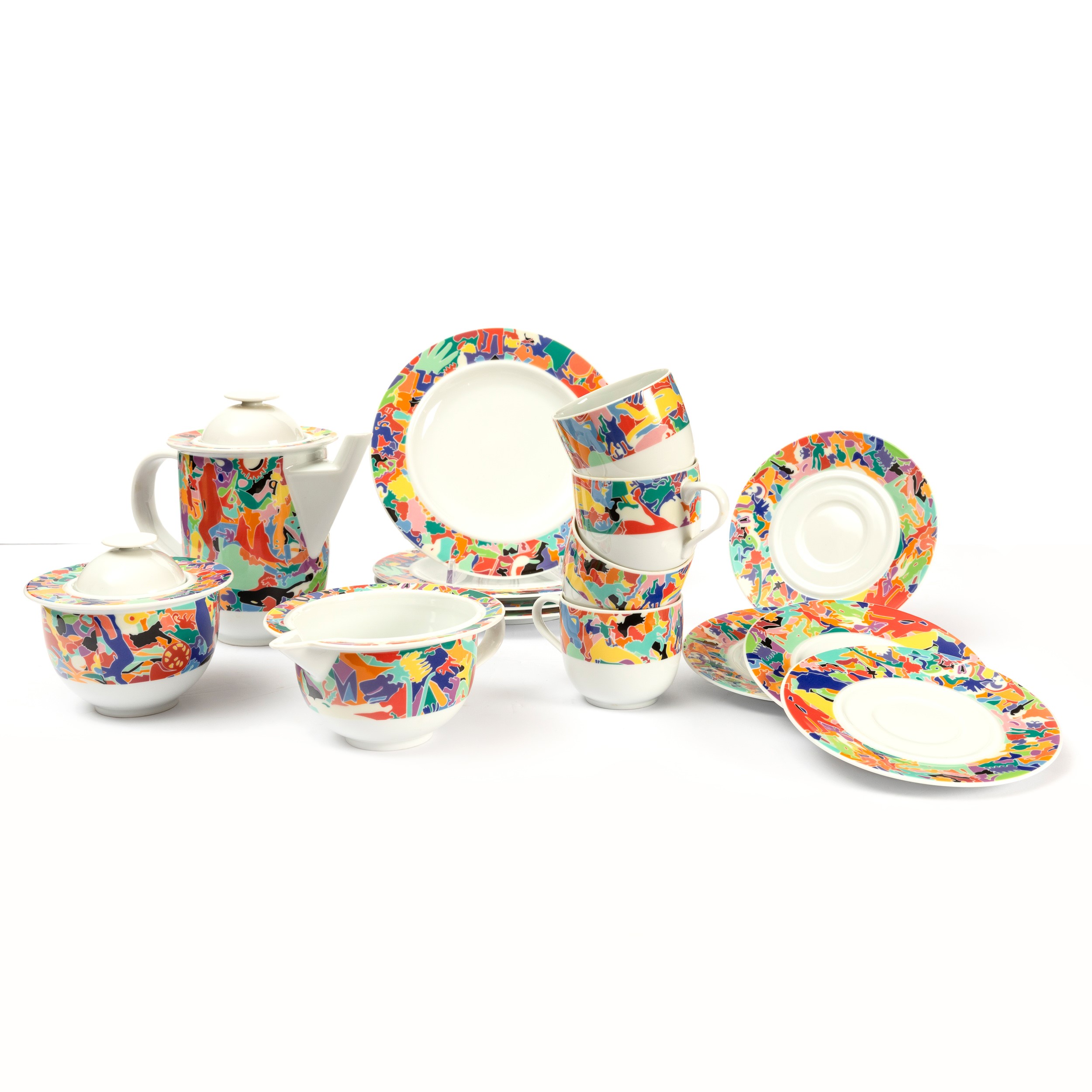 servizio da caffè La Bella Tavola - Alighiero Boetti 1993 set composto da caffettiera, lattiera, zuccheriera e quattro tazze con piattini e quattro piatti da dessert. Design di Ettore Sottsass, decoro di Alighiero Boetti, produzione Alessi, serie Tendenze Caffettiera cm 18x22x12; piattini diam. cm 12,5