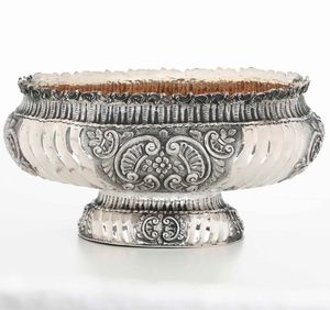 Centrotavola in argento fuso, sagomato e cesellato, con bordo mistillineo sbalzato [..]