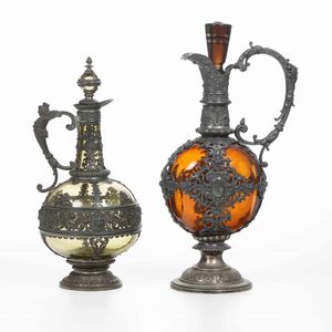 Bottiglia e brocca in vetro molato e argento, manifatture diverse del XX secolo