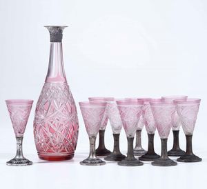 Lotto di dieci bicchieri e una bottiglia in cristallo rosa e argento, titolo 800. [..]