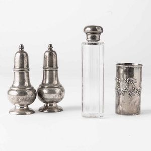 Lotto di un sale e pepe in argento 925, un vasetto in argento inglese e una boccetta [..]