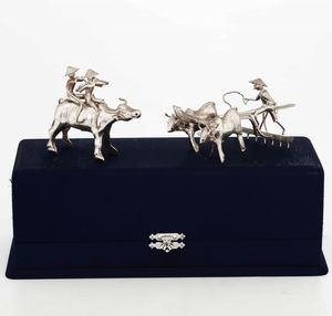 Due sculture in argento raffiguranti mucche e personaggi orientali. Argenteria artistica [..]