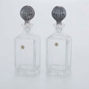 Coppia di bottiglie in cristallo con tappi in argento. Italia XX secolo